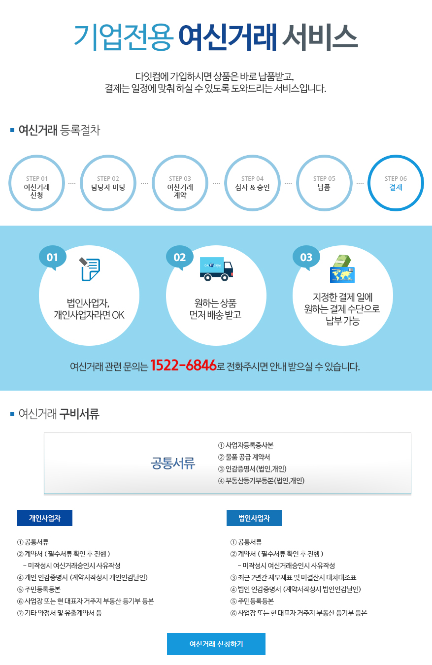 기업전용 여신거래 서비스 - 다잇컴에 가입하시면 상품은 바로 납품받고, 결제는 일정에 맞춰 하실 수 있도록 도와드리는 서비스입니다.